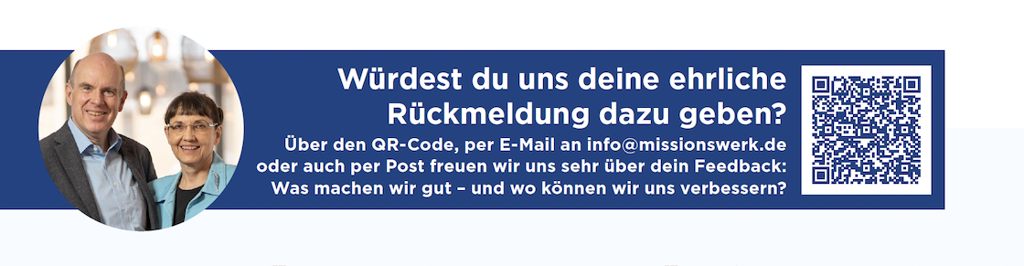 Über unsere Umfrage, per E-Mail an info@missionswerk.de oder auch per Post freuen wir uns sehr über dein Feedback: Was machen wir gut – und wo können wir uns verbessern?